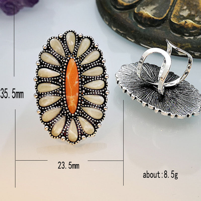 Bold Retro Aesthetic – This oversized ring combines vibrant turquoise with milky white jade, set in intricately designed 925 silver plating for a dramatic vintage look. High-Quality Craftsmanship – Each piece is hand-polished with an antique finish, ensuring durability while maintaining the authentic distressed appearance of European/American retro styles. Eye-Catching Statement Piece – The exaggerated width (approx. 2.5cm) and bold color contrast make it a standout accessory for boho, hippie, or festival fashion. Versatile Styling – Pairs effortlessly with layered necklaces or stackable rings, perfect for both casual outfits and evening wear. Ethical & Affordable – Silver-plated construction offers luxury appeal at an accessible price point, with hypoallergenic materials for sensitive skin.