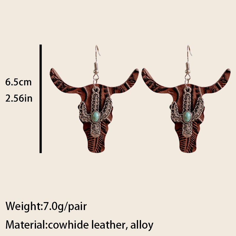 Authentic Western Craftsmanship – Intricately embossed bull head charms paired with textured cowhide and miniature cactus pendants, celebrating rugged Americana style. Premium Artisan Materials – Made with lightweight alloy, genuine leather accents, and distressed metal finishes for a vintage-worn, hypoallergenic look. Statement Dangle Design – Each earring measures 2.5"-3" long, offering eye-catching movement perfect for rodeos, festivals, or boho outfits. Gift-Ready Packaging – ideal for cowgirls, country music lovers, or anyone embracing wild-west aesthetics. Versatile Styling – Easily dresses up denim jackets or adds edge to sundresses, embodying free-spirited frontier charm.